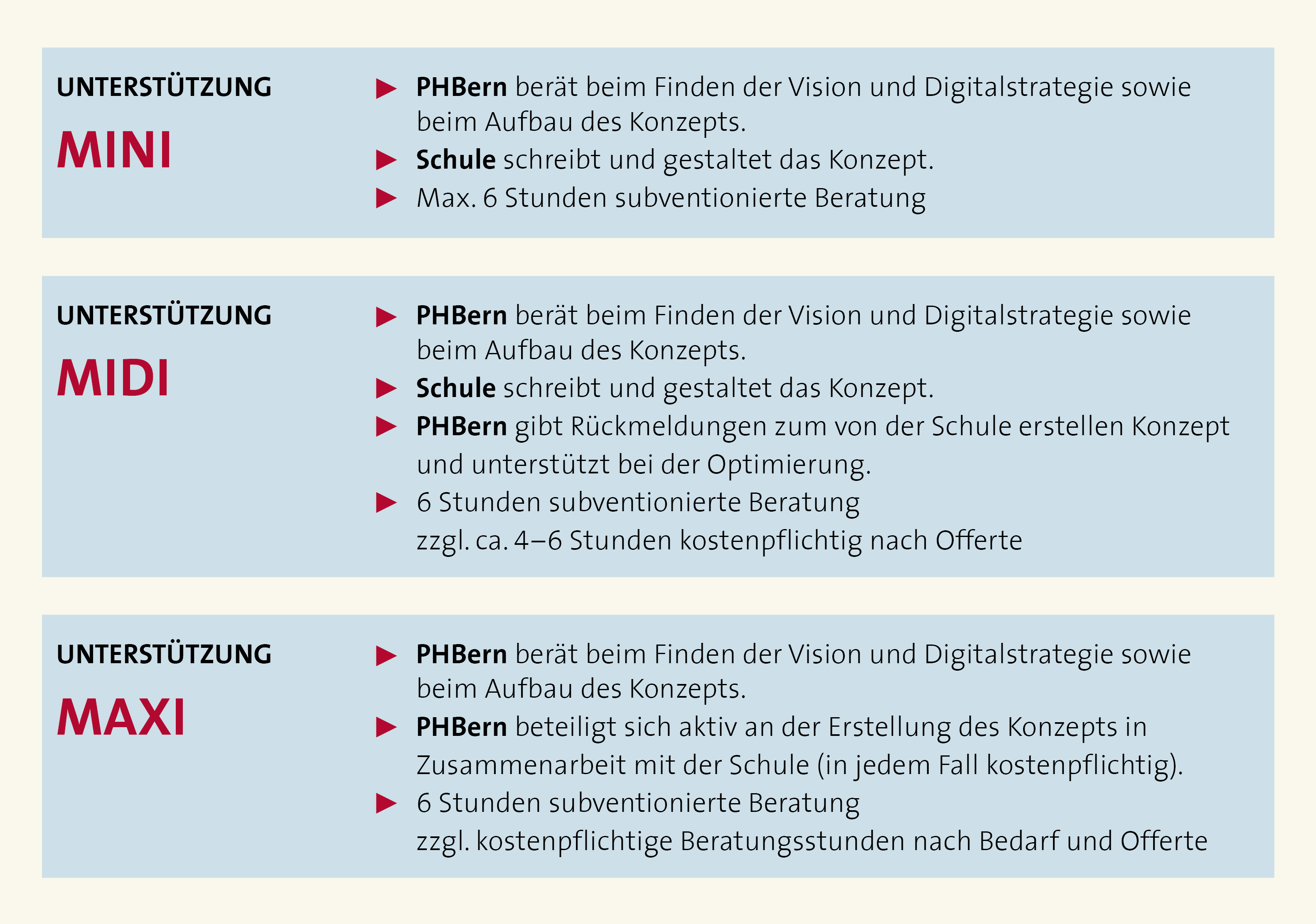 Die PHBern begleitet und unterstützt die Schulen und besonderen Volksschulen im Kanton Bern bei der Planung und Erstellung des Konzepts. Den Umfang der Unterstützung können die Schulen wählen.