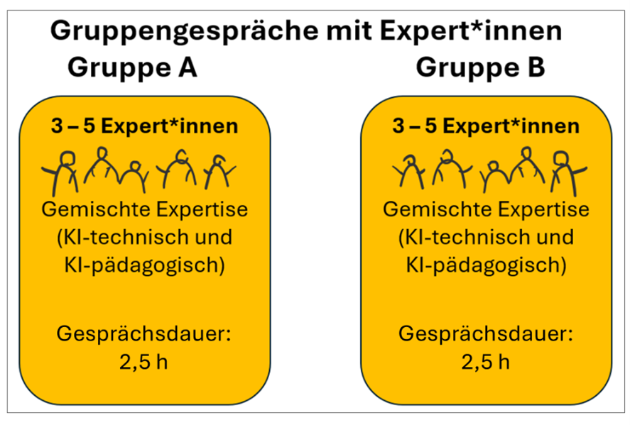 Für die Beantwortung der Forschungsfragen werden Gruppengespräche mit Expert*innen geführt. Die Expert*innen haben entweder einen Schwerpunkt im computertechnischen oder im pädagogischen Bereich bezüglich KI-basiertem Learning Analytics oder relevanten Teilaspekten davon. Als Expert*innen werden Personen angesehen, die zu diesen Themen forschen oder entwickeln, und deshalb eine im Idealfall langjährige Expertise aufweisen. Geplant sind zwei Gruppengespräche, die sich aus jeweils drei bis fünf Expert*innen zusammensetzen, wobei sowohl "Informatiker*innen" als auch "Pädagog*innen" beteiligt sind (also beide Expertisen sollen innerhalb eines Gruppengesprächs vorhanden sein). Ein Gruppengespräch dauert 2,5 Stunden und wird von zwei Moderator*innen begleitet. Die Gespräche werden nach entsprechender Zustimmung aufgezeichnet und anhand eines halbstrukturierten Leitfragebogens geführt. Die Auswertung erfolgt durch eine qualitative Inhaltsanalyse, wobei als Hilfsmittel die Software MAXQDA eingesetzt wird. Ein Ergebnisbericht beantwortet die Forschungsfragen und fasst die Ergebnisse zusammen. Insgesamt ist das Projekt zur qualitativen Forschung zu zählen.