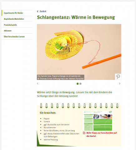 - Schlangentanz – Wärme in Bewegung: Lernende beobachten, wie warme Luft eine Papierschlange bewegt und lernen, dass Wärme Luft steigen lässt.