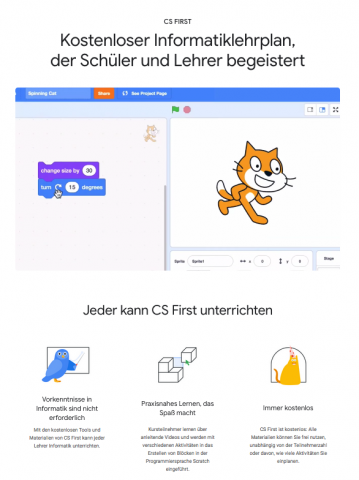 Lernplattform für ScratchMit der von Google entwickelten Lernplattform CS-First können ganz einfach Scratch-Projekte durchgeführt werden. Der Kurs kann von der Lehrperson schnell und kostenlos erstellt und angepasst werden. Die Unterrichtsmaterialien basieren auf Lernvideos, mit denen Lernende selbständig und in eigenem Tempo den Umgang mit Scratch erlernen können. Der Lehrperson bleibt somit Zeit für individuelles Betreuen. Hinweis: Es ist kein Google-Account notwendig. Die Plattform ist neu auch in Deutsch verfügbar.