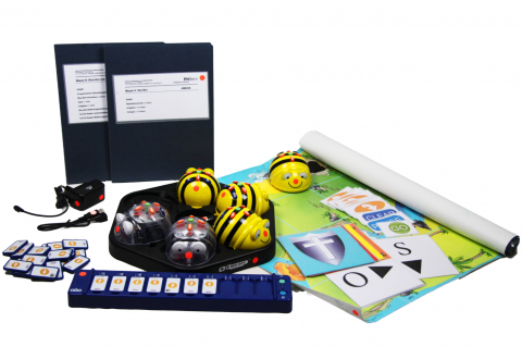 Medien- und MaterialkisteDie Medien- und Materialkiste beinhaltet neben den sechs Bodenrobotern (4 Bee-Bots und 2 Blue-Bots) Ladestationen, Spielmatten, TacTile Reader, Bedienungsanleitung und Aufgabenblätter als Kopiervorlage. Da die Arbeit mit den Robotern meist in Kleingruppen stattfindet, genügt in der Regel ein Gerät pro Dreiergruppe. Blue-Bots können analog zu den Bee-Bots eingesetzt werden, verfügen aber über zusätzliche Funktionen.
