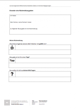 Die Übungs- und Anwendungsaufgaben sind als Stationen im Klassenzimmer verteilt. Bei allen Aufgaben geht es um das Abzeichnen von Hunden und Katzen. Die Lernenden entscheiden selbstständig und interessengeleitet, welche und wie viele Aufgaben sie erarbeiten und wie lange sie daran verweilen. In passenden Momenten wird die Arbeit an den Stationen durch formative Rückmeldungen unterbrochen. Während dieser Prozessphase sammelt die Lehrperson das Zeichenheft für eine förderorientierte schriftliche Rückmeldung ein.