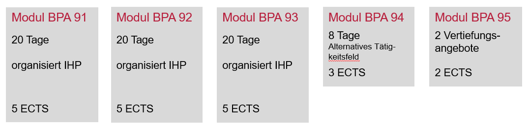 Im Rahmen der Berufspraktischen Ausbildung machen die Studierenden 4 Praktika und besuchen 2 thematische Vertiefungsangebote (Modul BPA95).