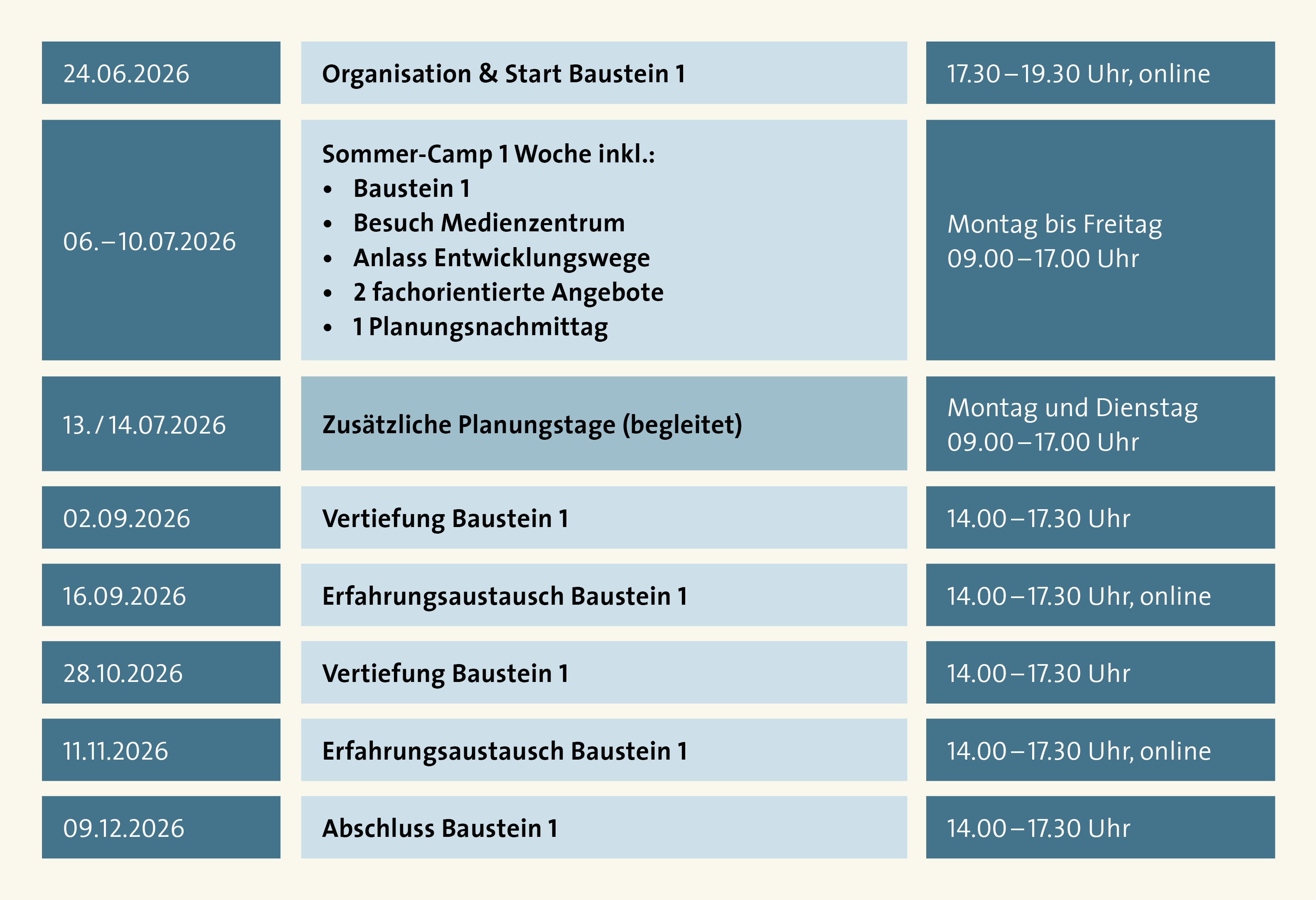 | 2.9.2026 | Vertiefung Baustein 1 | jeweils von 14.00-17.30 |